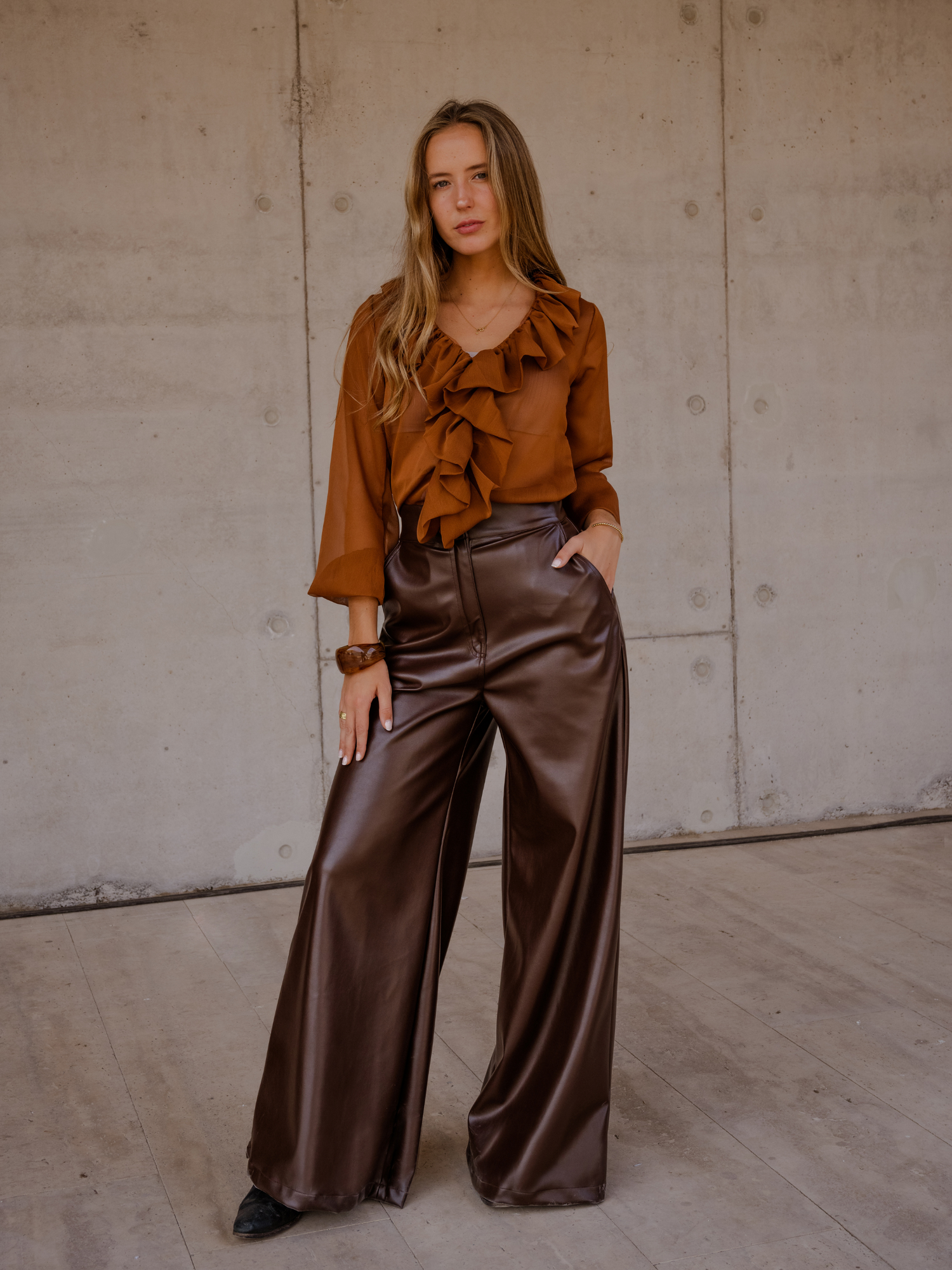 Confeccionados en tela doble faz con un interior de gamuza y el exterior de ecocuero que lo hace perfecto para esta temporada otoño invierno. De tiro alto y pretina ancha se convertirán en un básico de tus outfits.